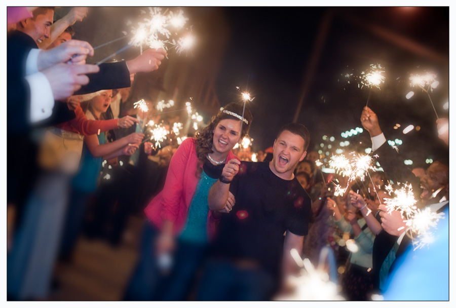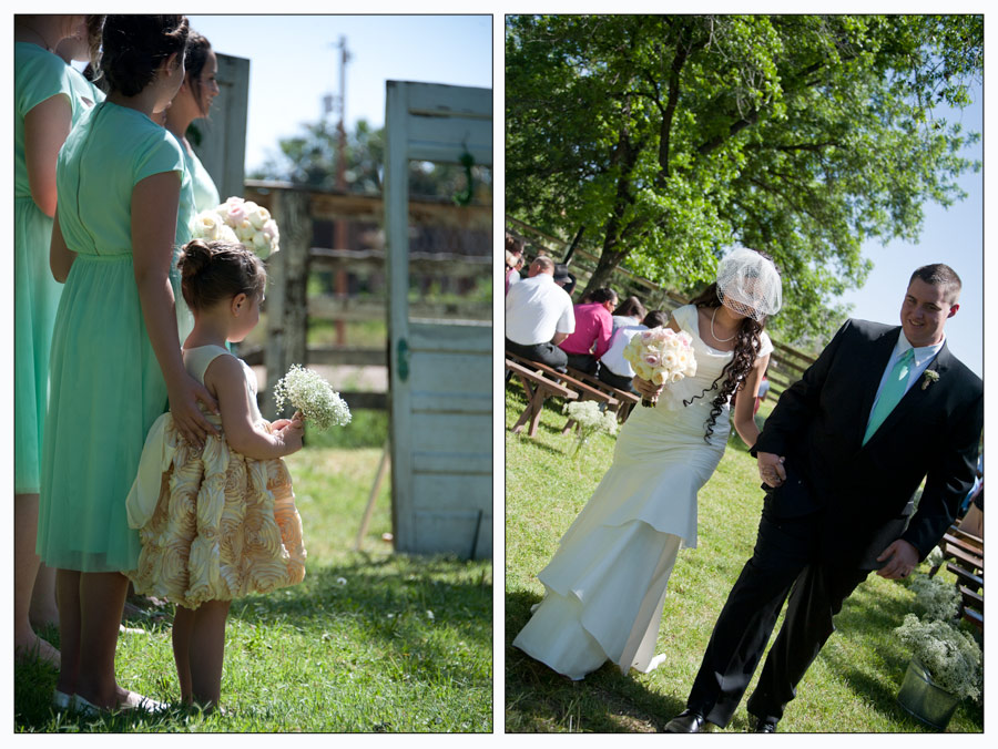 Once Amber found that farm location, Sophie pulled together a summery color scheme of yellows, blues, and reds. Amber, with her history as a wedding florist, incorporated the yellow color pop into a super cute billy ball bouquet and a sweet blue boutonniere with button accents. Sophie added farm details - hay bale ceremony seating, tin can flower holder on the backs of wood slat chairs, ragged ribbon streamers and garlands. . .